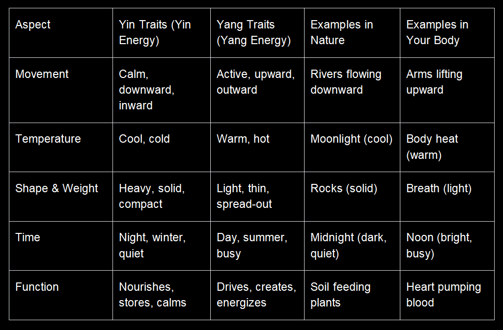 - Structure: Your skin, muscles, and bones (solid, visible) are more Yin; your breath, blood flow, and thoughts (light, invisible) are more Yang.
